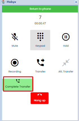 5.- When you listen to music on hold, just press the COMPLETE TRANSFER icon The customer will be waiting for the conference and the agent is free