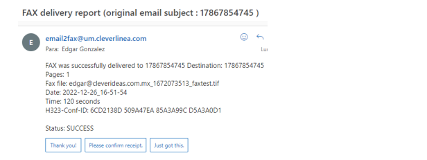 After you have sent the email, you will receive a confirmation with the FAX delivery status.