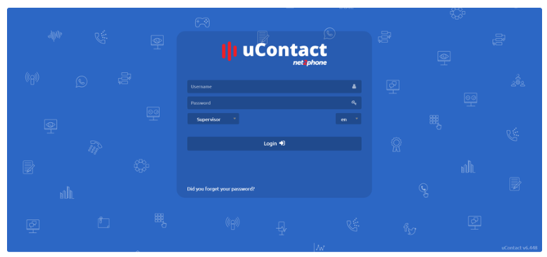 uContact Agent login is the main page that lets you select the language and role (Agent in this case) in which the user will work and validate his credentials, entering the URL : https://IPSERVER