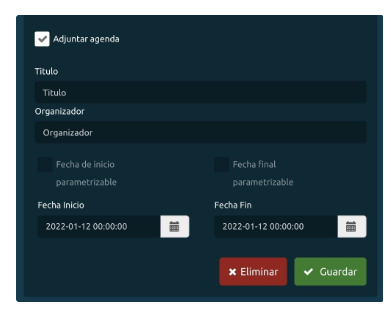 Nombre del evento. El título del evento también puede contener variables parametrizables, esta última será la variable detallada en el .csv subido para el marcador. Ej.: ${nombreVariable}-