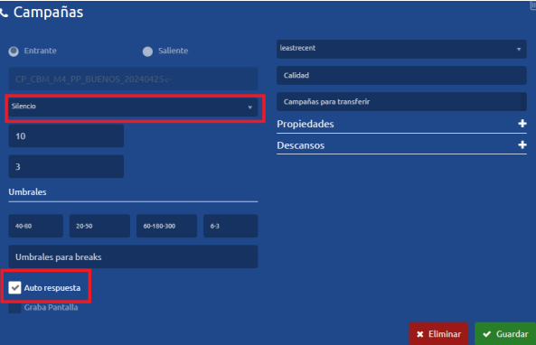 En todas las campañas por default se cuenta con un tono de espera para la llamada mientras es entragada a un agente, en cada instancia se encuentra creado un tono llamado silencio para que cunado el cliente conteste no proceda a colgar la llamada por indentificar que se le esta marcando de un call center, ademas este tiempo se puede disminuir si se agrega la uto respuesta a la campaña como se muestra en la siguiente imagen: