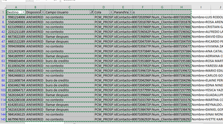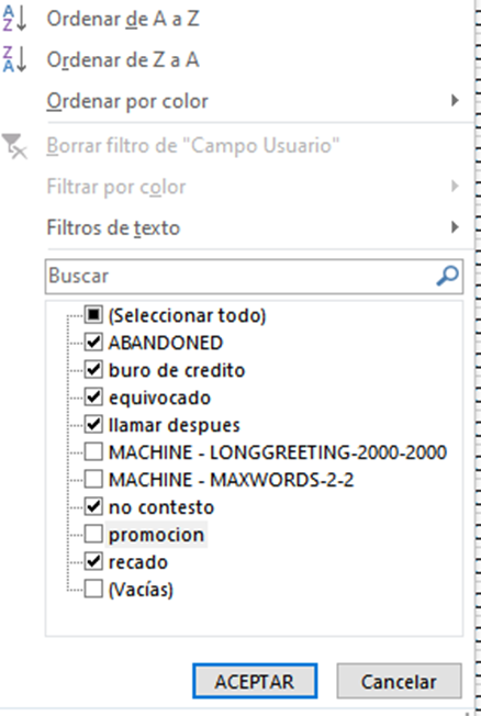 El segundo filtro que haremos sobre nuestro archivo es en la columna C (Campo Usuario), quitaremos las dispositions o tipifiaciones: