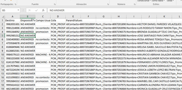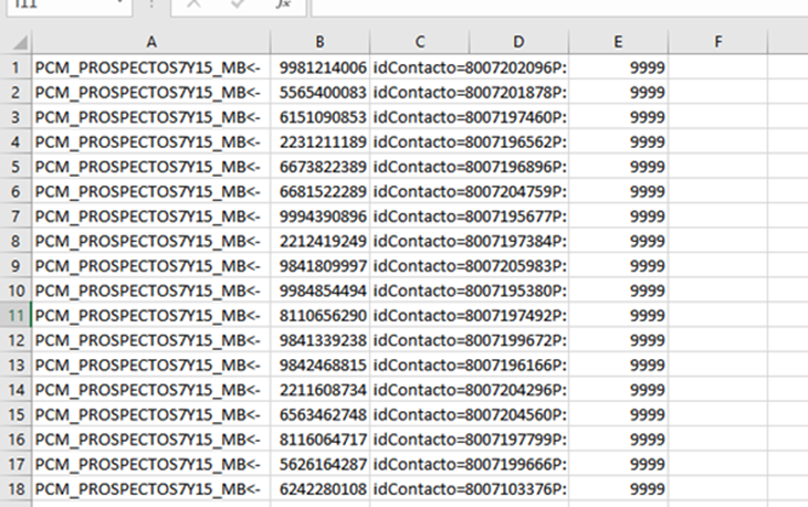 - En la columna B dejaremos el destino (número telefonico del cliente),