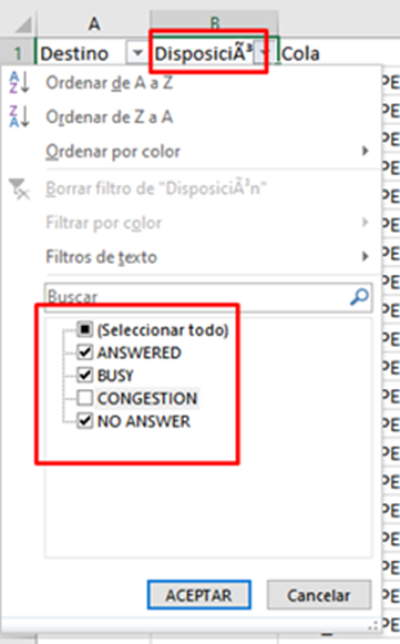 Haremos los filtros para eliminar lo que no necesitamos y proceder a cargar nuestra base, en la columna B (dispositions) dejaremos todo excepto las Congestion, Damos click en aceptar.