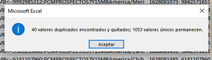 - Nos enviará un mensaje en el cual nos dirá cuántos registros únicos nos quedaron para trabajar, damos click en aceptar.
