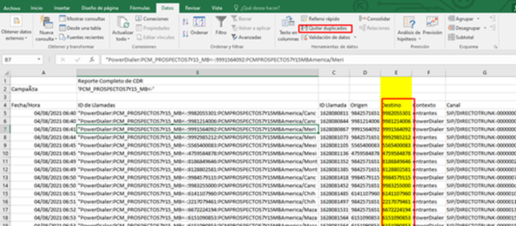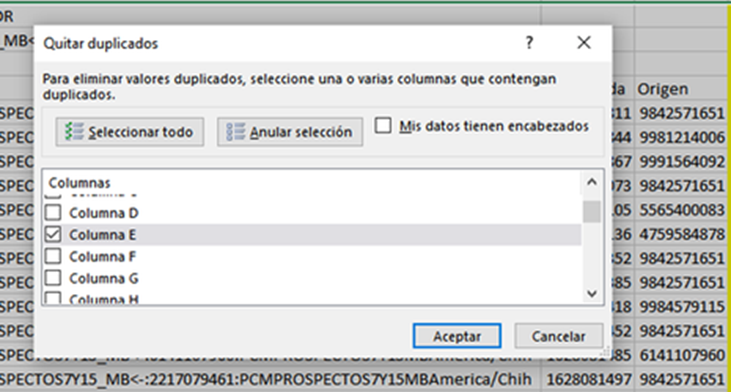- lo haremos solo por la columna E, que es la columna que contiene los destinos o bien los números telefónicos de los clientes. Una vez seleccionada la columna E damos clic en Aceptar