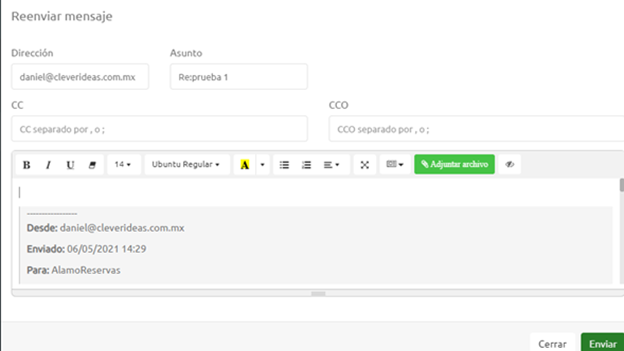 Y en la ventana de reenvió podremos editar los destinatarios, se abrirá una nueva línea de correos porque es un reenvió.