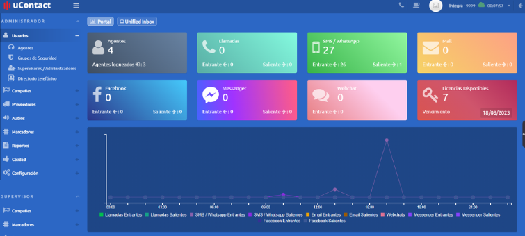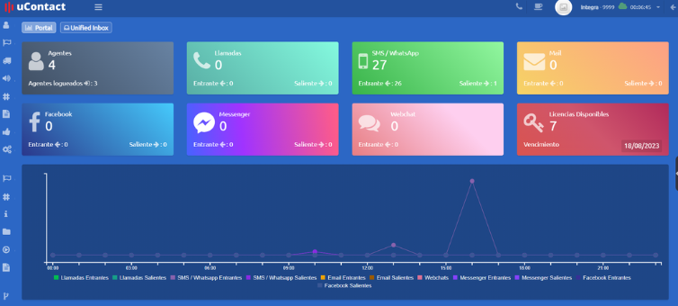 En la sección superior están las tarjetas de información de cada canal junto a las licencias disponibles y agentes conectados.