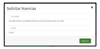 Al hacer clic en need more licenses se despliega el modal de solicitud de licencias.