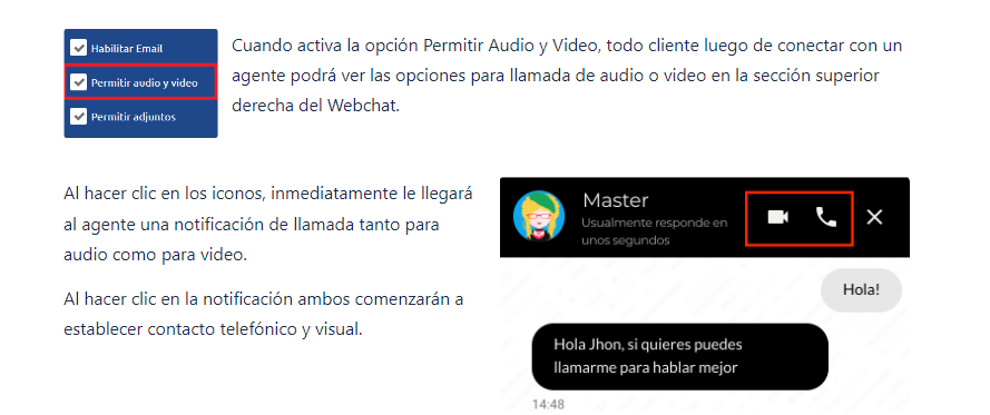 Cuando se encuentra activado, el cliente podrá iniciar llamada o videollamada con el agente.