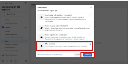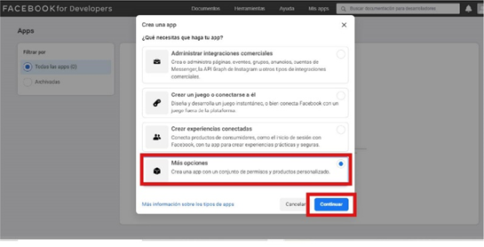 En la ventana ¿Qué necesitas que haga tu app? selecciona la última opción Más opciones y luego en Continuar.