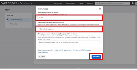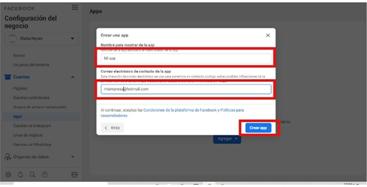Llena los campos de: Nombre para mostrar de la app con un nombre que identifiques posteriormente, y verifica que el correo concuerde con el mismo de tu cuenta de Facebook.