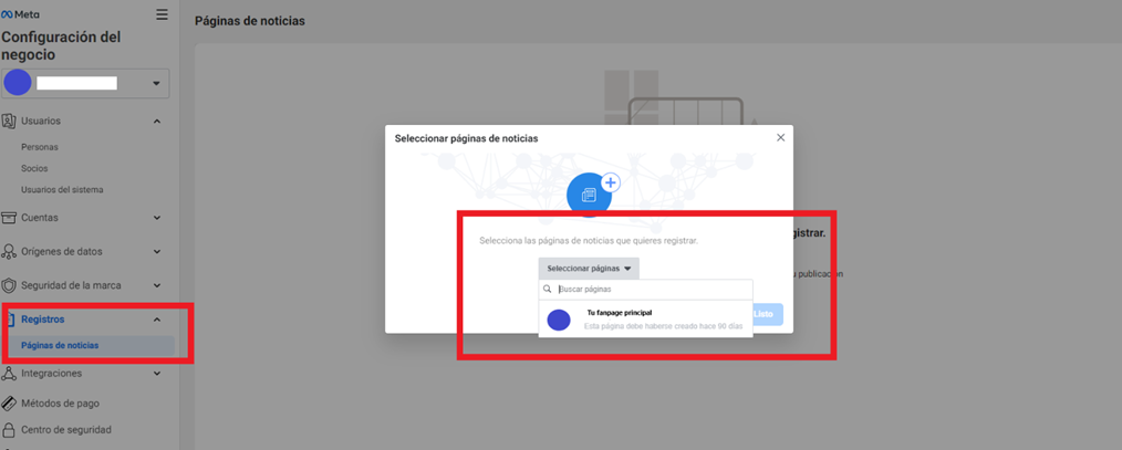 Posteriormente dirígete a Registro, luego a Página de Noticias y después selecciona la opción de Seleccionar páginas que se encontrará en el centro de la pantalla. Selecciona tu fanpage principal y luego en Listo.