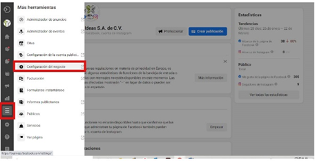 - Dentro de https://business.facebook.com/ dirígete a Más herramientas,