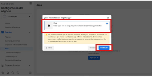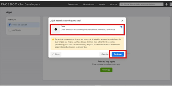 Aparecerá otra ventana ¿Qué necesitas que haga tu app?, donde debes seleccionar Otra y dar en Continuar.